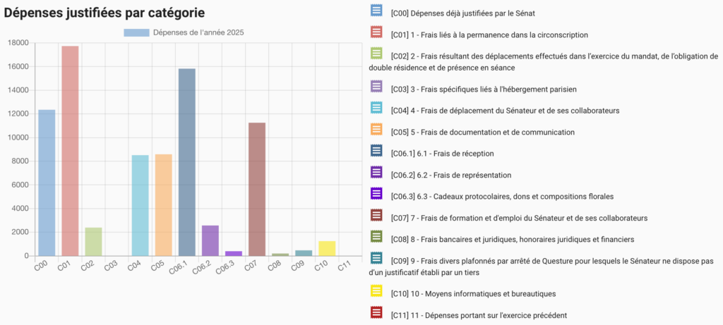 Le second est une avance de frais de mandat (AFM), versée chaque mois pour couvrir les dépenses nécessaires au bon travail de l’élu et de son équipe. Elle s’élève à 6600€/mois (au 1er janvier 2024). Chacune des dépenses doit être enregistrée sur une application dédiée et assortie d’un justificatif. Les dépenses sont strictement encadrées et font l’objet de contrôles réguliers. Elles doivent être en rapport avec le mandat parlementaire, être de nature raisonnable et ne pas enrichir personnellement le sénateur. Ces dépenses regroupent les frais liés à la permanence, aux repas, aux déplacements, à la documentation et communication, à la représentation, aux moyens informatiques et bureautiques, etc.