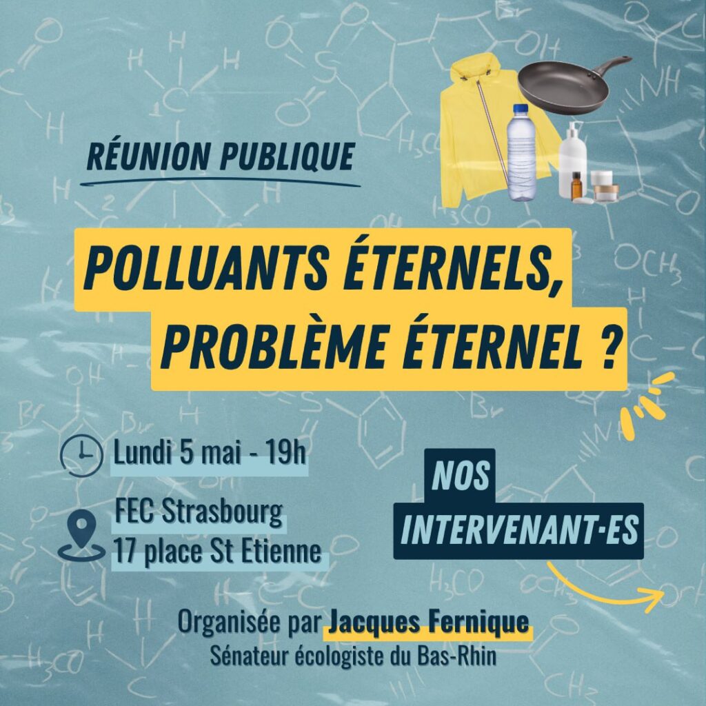 J’organise une discussion publique sur les polluants éternels (les PFAS), le lundi 5 mai 2025 à 19h, au FEC, à Strasbourg.